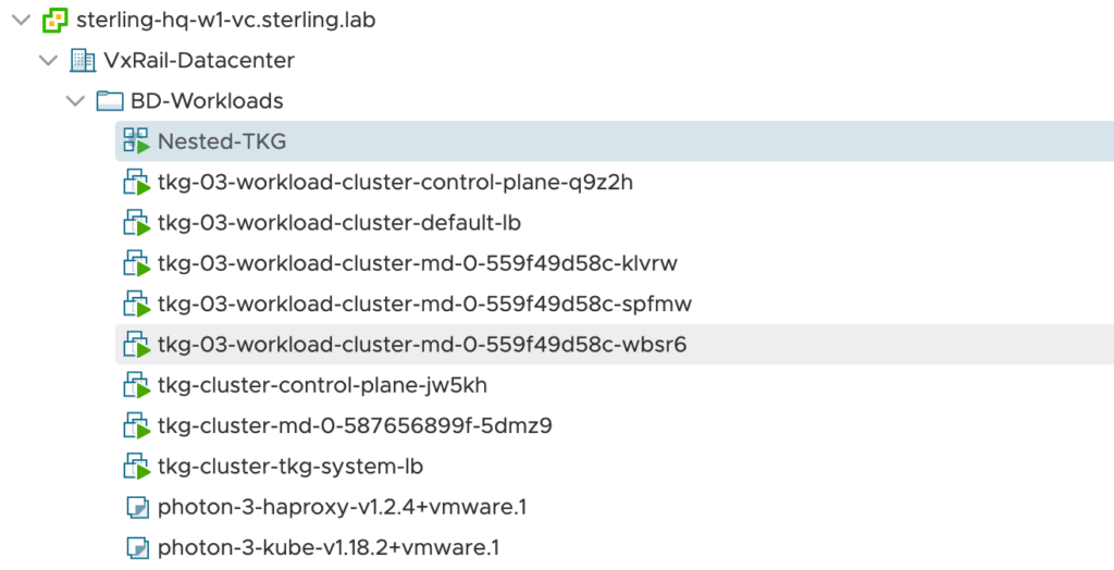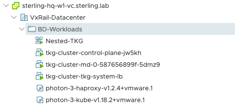 At this point, we’ve used Tanzu Kubernetes Grid to deploy a management Kubernetes cluster supporting all ClusterAPI custom resource definitions and control loops, in addition to using that management cluster to deploy multiple subsequent workload clusters ready for application loads, all on top of our existing vSphere 6.7u3 environment, Figure 15 and Figure 16.