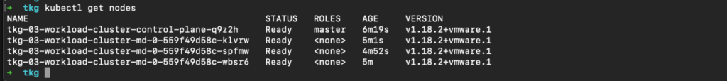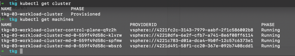 Here, we will use the standard TKG CLI to easily create an entire cluster by sending the manifest to the TKG management K8’s cluster, Figure 13, named tkg-03-workload cluster.