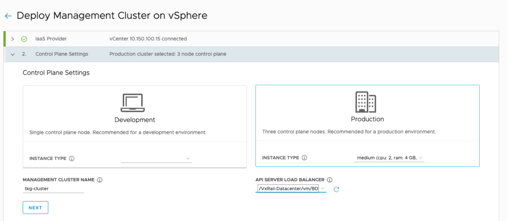 Figure 6 – Example Input for TKG deployment, selecting the control plane settings, and identifying the Templates uploaded to our environment as part of the prerequisites.