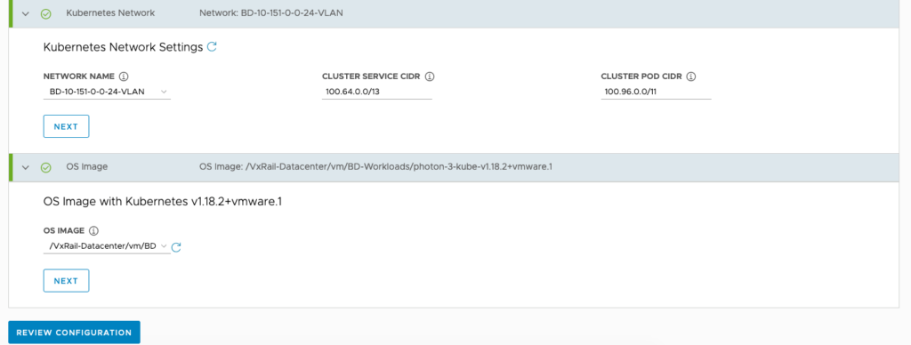 Figure 7 – Example input for TKG deployment, selecting the network attachments (vDS Port Group in this example)