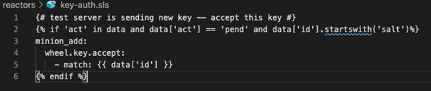 This blueprint deploys the full stack for SaltStack Enterprise utilizing a centOS 7 template for the Master and Ubuntu18 for all the Minions. This allows Salt Enterprise to have the configuration needed, while still deploying configuration to the Minions and setting them up to communicate with the Master. On top of the SaltStack solution, we deployed an NSX-T Load Balancer for the front-end web servers with vRealize Automation. This allows the servers for SaltStack via Cloud-Init to be configured. Once Cloud-Init configures the Master and Minions, it will clone the needed repository to the Master and perform all the needed configurations. The first thing the Master will need to do is accept the Minion Key. Minions use Key Authorizations to create a communicative link to the Master. Before anything can be pushed from the Master to the Minion, the Key must be accepted in the Master. This process was automated with a piece of code in the Reactor to auto-accept Keys. Figure 3 is a snippet of the code: