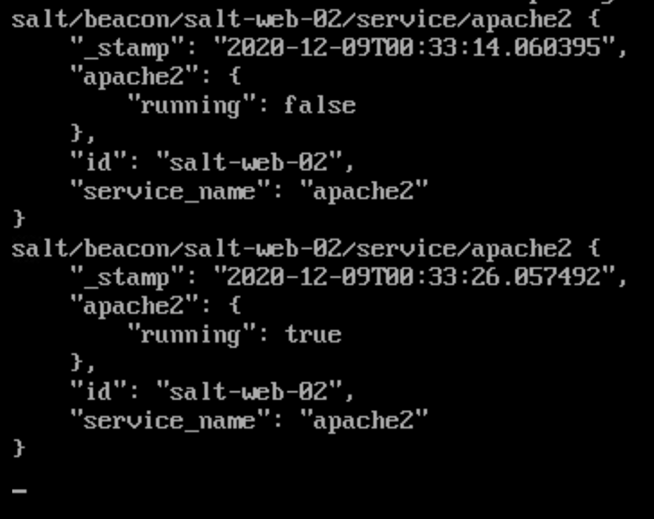 You can see the apache2 service being stopped and Salt Master restarting the service.