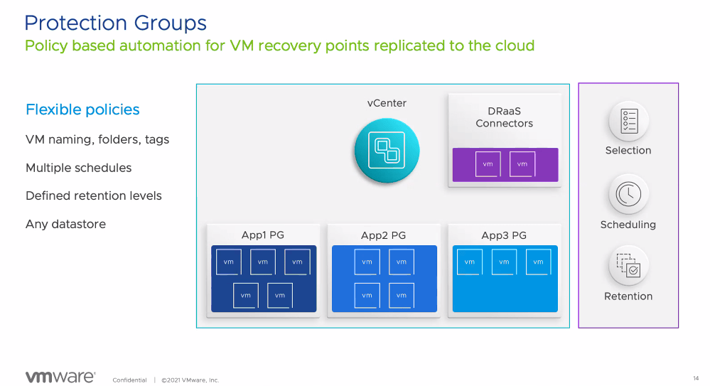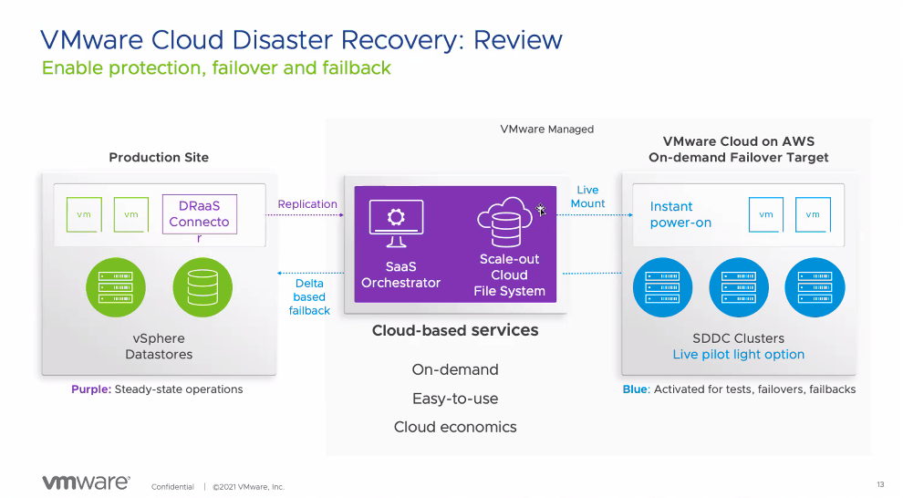 Enter VMware Cloud Disaster-Recovery (VCDR). VCDR allows users to run backups on their critical applications within their VMware environment. This ensures that each critical virtual machine has the needed data should the need arise to revert the machine or move it to a different location. VCDR currently only targets VMC on AWS, which is an on-demand solution for a full-stack VMware environment including computing, networking, and storage. VMC on AWS also allows users to access native AWS services from your VMware environment, attaching additional services by way of its integrated console. By specifying VMC on AWS as the target, VCDR is allowing the greatest cost savings for BCDR (Business Continuity Disaster Recovery) that can be allowed.