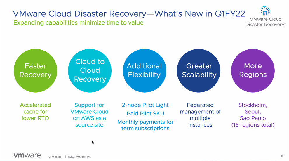 Since VMC on AWS is ‘on-demand,’ you don’t even need a target data center to send your backups to. You simply create the template that shows how that VMC on AWS solution will look once it’s set up, and then it will attach your backup storage to that SDDC (Software Defined Data Center) and restore your critical applications. VCDR does this by storing your change-block data and full backups within a central repository in the VMware Cloud. If you are running a cold DR, in which the target datacenter is not built, this solution will probably be a very cheap way to have a three to four hour restore target for your restoration.
