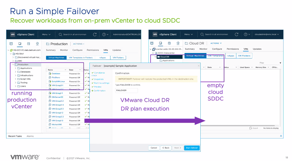 Some organizations will not be ready when disaster strikes, nor will they have service-level agreements in place that will work with a four-hour restoration and will need something faster. This is where VCDR allows a “Pilot light DR” or “Hot DR.” These DR solutions require a set of pre-built infrastructures that can be utilized for the recovery target. Depending on which you want to use, these recovery targets can be used for Tier -1 applications (apps that must never go down). Tier -1 apps are set up in extremely high-availability locations such as VMC on AWS. (Tier 0 would be applications in your private datacenter, which would need to be restored in a couple of minutes or less in the event of an incident).