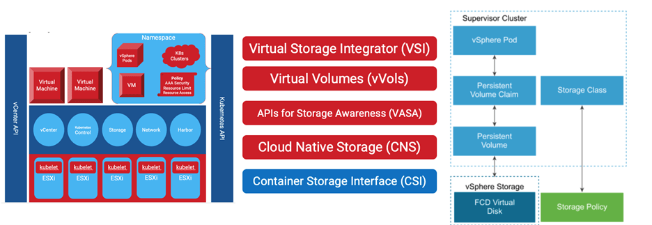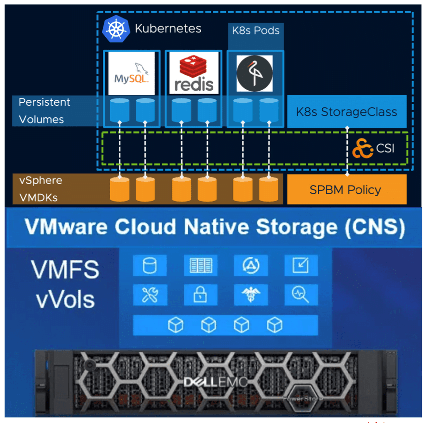 In a VMware environment you can realize this through the normal Virtual Volume (vVol) integration alongside enabling vSphere with Tanzu to present a Kubernetes API, tying everything together. ESXi hosts become Kubernetes data-plane nodes managed by a dedicated Supervisor control cluster, and PowerStore is integrated into vSphere through APIs for storage awareness (VASA) and Virtual Storage Integrator (VSI), resulting in a bidirectional understanding from compute to storage translated through standard Kubernetes storage classes and persistent-volume claims. If an application owner requires a stateful storage device to be provisioned using first-class disks, they simply request a persistent-volume claim attached to their workloads through Kubernetes, and the infrastructure handles the rest. Figure 1 is a visualization of the interconnection between our traditional compute environment and our storage platform, including tools such as Cloud Native Storage (CNS) and the Container Storage Interface (CSI) to tie this traditional environment into Kubernetes.