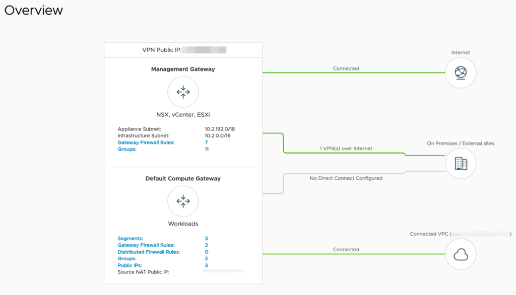 From the perspective of our VMC console, the topology is reflected in Figure 1 and Figure 2, displaying our SDDC resources and network layout for internet connections, and a layer 3 policy-based VPN connecting our on-premises to the cloud environment.