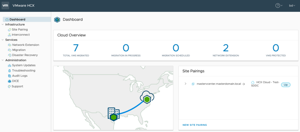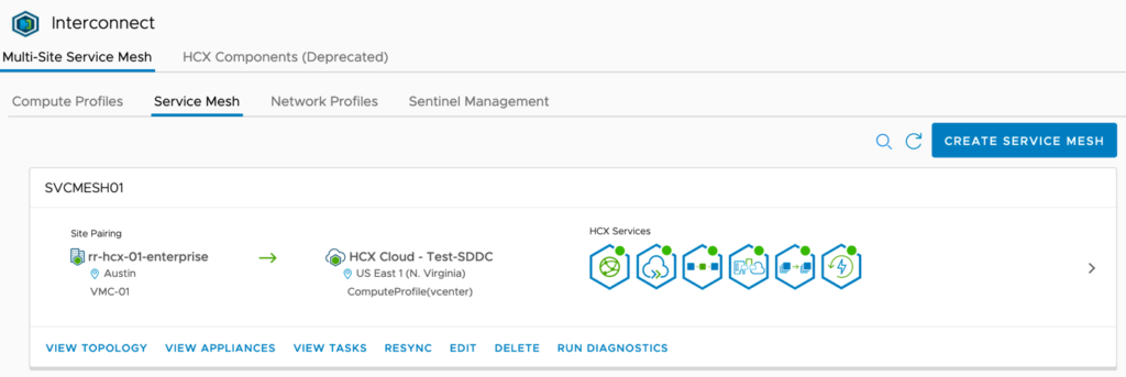 Highlighted within the blue box are a few workloads associated with each environment. Here our goal is to be able to seamlessly transition workloads across clouds without taking an outage. To accomplish this, VMware HCX is deployed to establish layer-2 extensibility across environments to allow vMotion-based migrations while maintaining IP-addressing and DNS resolutions. Figure 4 displays the connection status of our two environments, while Figure 5 details the service mesh and associated services used.