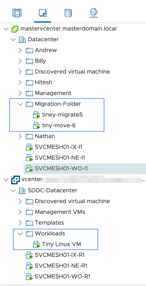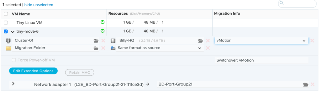Within our HCX service mesh we can see several capabilities; however, in this use-case we’ll focus on layer-2 extensions. In this environment, two port-groups are extended from our on-premises environment: BD-PortGroup21 and NB-Port-Group43 (Figure 6). Our goal here is to migrate the virtual machine tiny-move-6 from our cloud environment to our on-premises environment without taking an outage using vMotion through HCX. Looking back at Figure 3, We can confirm the current location of tiny-move-6 in the VMC environment from our single pane of glass management across the hybrid cloud.