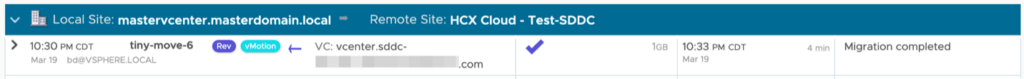 Let’s move workloads around. Figure 7 shows the current IP of our tiny-move-6 virtual machine that we can reach from our on-premises environment through the HCX built Layer-2 extension into the cloud.