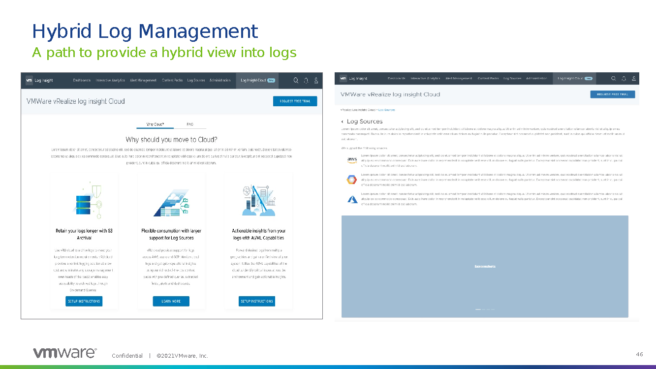vRLI adds hybrid log management with cloud to the logging solution. This means that you can connect your logging solution into things like S3 for storage or archival storage, consume multiple log sources within the cloud, and connect vRLI with AI/ML workloads to find suggestions on what to do to address environmental issues.” This all adds capabilities for on-premises to connect externally.