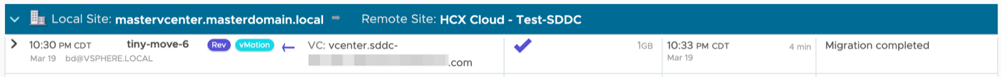 Within the HCX plugin provided within the vCenter Cloud Gateway we can kick-off a migration by setting some basic parameters and going through a validation, as shown in Figure 9. Figure 10 displays the successful migration and Figure 11 reveals the new location of the tiny-move-6 virtual machine to our on-prem data center.