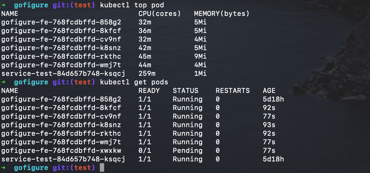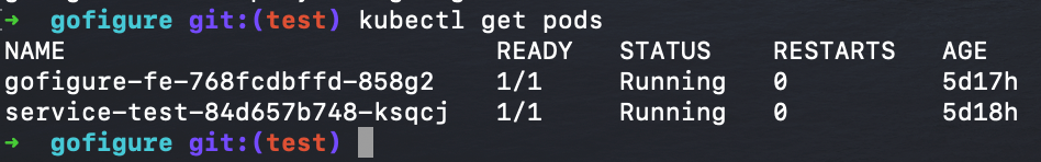 Figure 5 shows a quick review of the pods currently running on the TKG cluster, note the amount of gofigure-fe pods supporting the front end that are running.