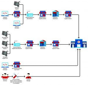 Entry points that threat actors can use to compromise the hospital supply chain range from manufacturers to distribution centers and transportation companies, from third-party contractors to developers of software and mobile apps hospitals use, from past to non-core services staff. (figure 1. image supply chain flow)